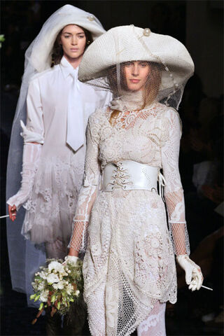 Fifty-five-year-old designer Jean-Paul Gaultier has never been a fan of "subtle". Known as the enfant terrible of French fashion, many of his collections have been based on streetwear, and then twisted into over-the-top, playful, unusual ensembles. He made Madonna's famous cone-bra and often showed skirts (kilts and otherwise) for men on the runway. Gaultier also did the wardrobe for films like The Fifth Element, Kika, The Cook, the Thief, His Wife & Her Lover, and The City of Lost Children. The collection he showed today in Paris has a clear vision, and that vision is of motocross-riding, beekeeping, and military corpse bride pirates. Of course! Oh, and almost all of the models were smoking. We were compelled to channel their swashbuckling thoughts. Click on any picture below to bring up the annotated gallery.