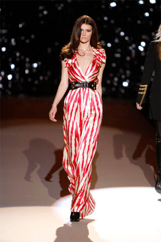 Founded in 2000, Alice Temperley's Temperley London label is all about fusing boho style with a dash of sophistication and a pinch of punk sensibility, and her Fall/Winter 2008 collection, shown late yesterday, played heavy on the rock 'n' roll sensibility. Leggings of all sorts (pleather, velvet, super-shiny) were seen under frocks that billowed at both long and short lengths. Bowler-hats polished things off, making for a Johnny Depp in Pirates of the Caribbean femme-butch sensibility. Especially in that red-and-white striped dress: Ahoy! Gallery begins below.