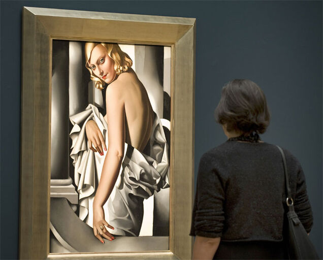A reporter views Tamara de Lempicka's 'Portrait de Majorie Ferry' during a media preview May 1, 2009 at Sotheby's in New York. The work from the collection of Wolfgang Joop is scheduled to sell at auction May 5-6, 2009 in New York. AFP PHOTO/DON EMMERT (Photo credit should read DON EMMERT/AFP/Getty Images)
