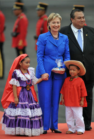 US Secretary of State Hillary Clinton is welcome by two Salvadorean children in tradicional dresses upon her arrival at the Comalapa international airpot, some 45km south of San Salvador May 31, 2009. Clinton arrives to attend Salvador's president elect Mauricio Funes' inauguration on Monday. AFP PHOTO/ Yuri CORTEZ (Photo credit should read YURI CORTEZ/AFP/Getty Images)