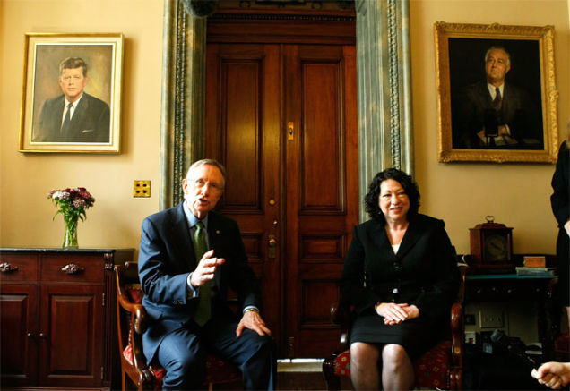 WASHINGTON - JUNE 02: U.S. Supreme Court nominee and Federal Appeals Court judge Sonia Sotomayor (R) meets with Senate Democratic Leader Sen. Harry Reid (D-NV) (L) on Capitol Hill June 2, 2009 in Washington, DC. Sotomayor made her rounds on the Hill to visit senators who will vote for her confirmation process. (Photo by Alex Wong/Getty Images)
