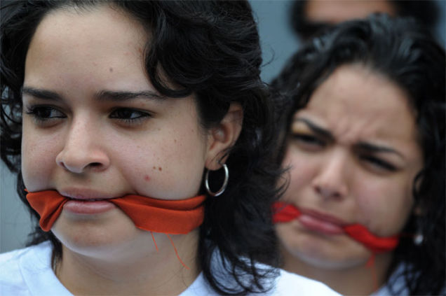 Activists of the 'World Without Gag' organization stand a protest June 25, 2009 in front of the Venezuelan embassy in Tegucigalpa for freedom of speech in Venezuela and against the measures taken by the government of President Hugo Chavez against private television channel Globovision. AFP PHOTO Orlando SIERRA (Photo credit should read ORLANDO SIERRA/AFP/Getty Images)
