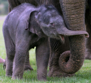 WHIPSNADE, ENGLAND - JULY 28: A newborn Asian elephant stands with other members of its herd at Whipsnade Wild Animal Park on July 28, 2009 in Whipsnade, England. The 6 day old Asian elephant (Elephas maximus), as yet unnamed, weighed 20 stone at birth and stands at only 3 ft tall. (Photo by Dan Kitwood/Getty Images)
