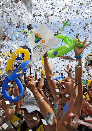 A cheerful crowd roars of joy in Copacabana Beach in Rio de Janeiro, Brazil as it is officially announced that their hometown will stage the 2016 Olympic Games, October 2, 2009. Rio de Janeiro's dream of bringing the Olympics to South America for the first time became reality here on Friday when they won the vote to host the 2016 edition. The Brazilian city saw off Madrid - by 66 votes to 32 - in the final round of voting after odds-on favourites Chicago, backed by a personal visit from President Barack Obama, had gone out in a first round sensation. AFP PHOTO/VANDRLEI ALMEIDA (Photo credit should read VANDERLEI ALMEIDA/AFP/Getty Images)