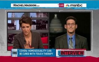 Then there's Richard Cohen. Cohen claims he is both a former gay man and a therapist (he's not licensed). His book Coming Out Straight was cited as an authoritative text at the conference that led to the Ugandan anti-gay bill, as proof that homosexuality was actually misdirected love for a parent. On Rachel Maddow, he responded to Maddow's claim that he has "blood on his hands."