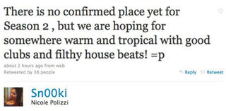 Today in Tweet Beat, Snooki mentions that the second season of Jersey Shore might be filmed somewhere "tropical," Kim Zolciak finds Debbie Gibson inspirational, and Meghan McCain thinks Glenn Beck is predictable.