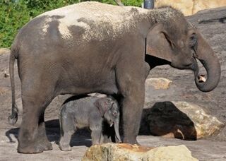 The newborn male Asian elephant, nicknamed 'Mr Shuffles' by staff, shelters under his mother 'Porntip' during his first public appearance at Taronga Zoo in Sydney on March 14, 2010. The baby elephant was believed to have died during labour but was born alive on March 10, amazing its keepers and defying expert opinion that such an outcome would take a 'miracle'. AFP PHOTO / Torsten BLACKWOOD (Photo credit should read TORSTEN BLACKWOOD/AFP/Getty Images)