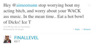 Today in Tweet Beat, Aimee Mann disses Ice-T's acting and he tells her to eat a "bowl of dicks." Also, Adrianne Curry talks more shit on Tyra, and today is Hugh Hefner's 84th birthday.