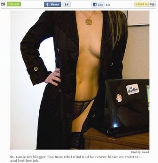 According to Tom Finkel of The Riverfront Times, 37-year-old blogger and mom The Beautiful Kind was happily employed doing part-time office work for a nonprofit organization, and hoped she would soon go full-time. Instead, a "Twitter glitch" led her boss to her blog, which included a sex-advice column, porn reviews, and descriptions of TBK's own sex life (she's since taken down most of the content). From an April 23 post, still available in cached form: