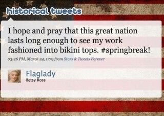 What Would Betsy Ross Tweet?Irin Carmon5/04/10 5:30pmFiled to: girl talkBetsy ross twitterBetsy RossGirls Gone WildBikinisAmerican Flags29EditInvite manuallyPromoteDismissUndismissHideShare to KinjaToggle Conversation toolsGo to permalink Michelle Obama may have made history tweeting, but what if other women of historical importance had done the same? Here's one possibility. [HuffPo] Reply29 repliesLeave a reply