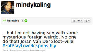 Mindy Kaling Is Up For The Eating, Praying—But The Loving? Not So MuchDodai Stewart8/13/10 2:04pmFiled to: notable quotableMindy Kalingeat pray loveJoran van der SlootCelebrity79EditInvite manuallyPromoteDismissUndismissHideShare to KinjaToggle Conversation toolsGo to permalink It's true that the story of a woman traveling abroad can end a few different ways. Thanks for the reminder!Reply79 repliesLeave a reply