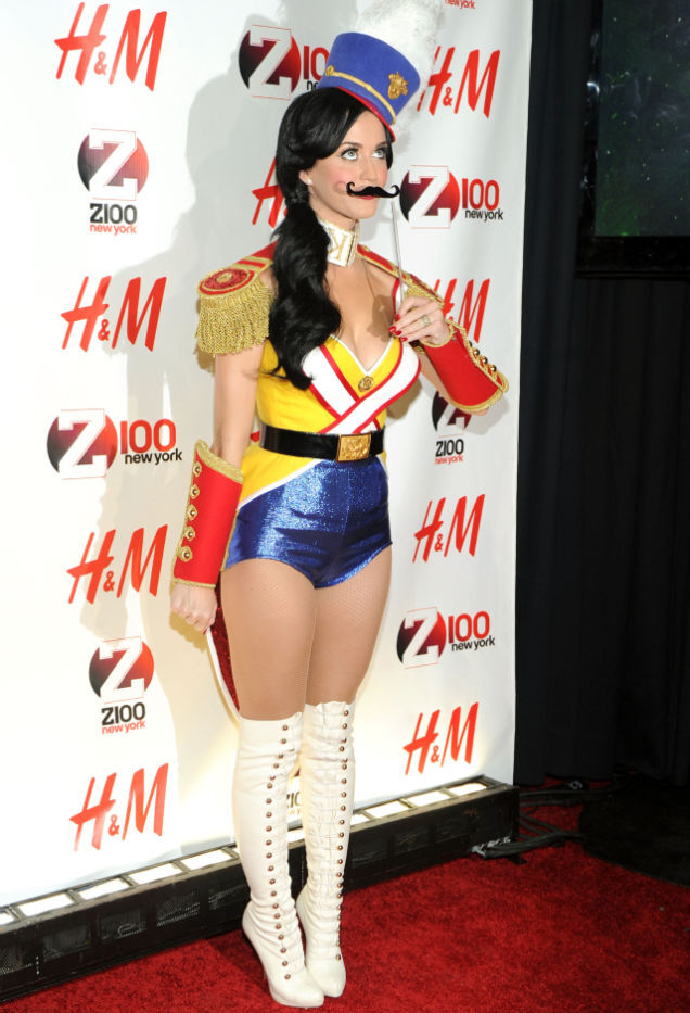 [New York, New York, December 10: Katy Perry synthesizes two different looks and hides behind her mustache at Z100's Jingle Ball 2010 at Madison Square Garden. Image via Getty.]