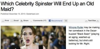 Fox News Slideshow Asks, "Which Celebrity Spinster Will End Up an Old Maid"?Irin Carmon12/13/10 12:08pmFiled to: AssholesCelebrity spinstersWinona RyderFox NewsfailsodaheadCelebrity48EditInvite manuallyPromoteDismissUndismissHideShare to KinjaToggle Conversation toolsGo to permalink It appears to be syndicated from Sodahead.com, whose tagline is "Opinions... Everybody's got them." Like assholes!Reply48 repliesLeave a reply