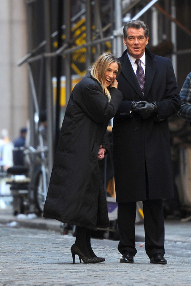 [Thomas James Bond Crowne must have said something rather amusing to Carrie Bradshaw. Wait wait! Don't tell us. Something to do with sex, right? Isn't that always the way. Dapper man + smart woman = copulation jokes. On the set of I Don't Know How She Does It. New York, February 7. Image via Splash.]
