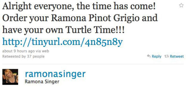 Ramona Singer Releases Own Pinot GrigioTracie Egan Morrissey2/07/11 8:00pmFiled to: Tweet beatWeird Al Yankovicwendy williamsramona singerJackie Collinsjenny shimizuDave NavarroBob SagetMindy Kaling41EditInvite manuallyPromoteDismissUndismissHideShare to KinjaToggle Conversation toolsGo to permalink Today in Tweet Beat, it's Turtle Time. Plus Bob Saget talks shit. Reply41 repliesLeave a reply