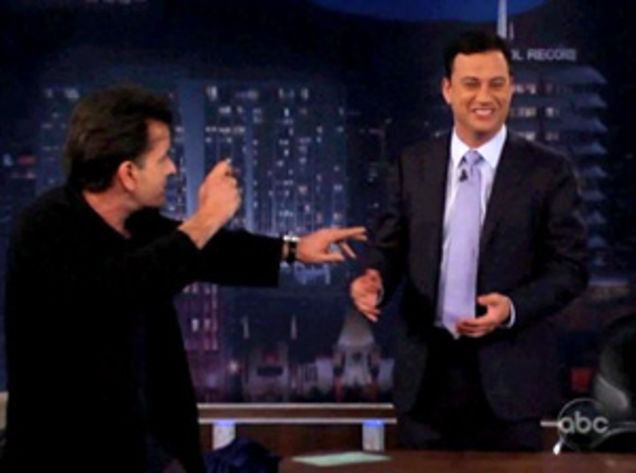 Last night Charlie Sheen crashed an interview with Mark Cuban on Jimmy Kimmel Live, where he planted an extended kiss on the host's lips. While everyone else is mulling over what Sheen could've possibly meant with the cryptic gift he gave Kimmel (a mug with pictures of a fox pasted on it, which some believe to be a hint that he will be getting his own late-night talk show on Fox after meeting with the network last week) we're dying to know just one thing: What does that breath taste like?