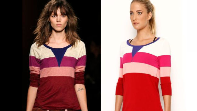 Does this "Courtney Henley" by Australian brand Lorna Jane look familiar to you? Let's see. The sleeves and bodice are dark red, with three wide stripes in pale pink, bright pink, and cream. The color-blocking theme continues with the use of constrasting blue trim around the neck and a blue V-shaped inset of fabric in the front. Hmm. Oh, wait, I know what this reminds me of! It reminds me of the exact same top, which was made by the designer Isabel Marant and shown in Paris this March. What a funny coincidence!