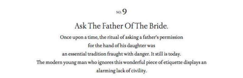 "Ask the father of the bride. Once upon a time. the ritual of asking a father's permission for the hand of his daughter was an essential tradition fraught with danger. It still is. The modern young man who ignores this wonderful piece of etiquette displays an alarming lack of civility."