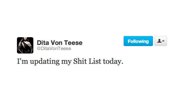 In today's Tweet Beat, Dita Von Teese's shit list gets an update, Cher loves Chad Michaels, Larry King is still figuring it all out and Chuck D reminds us that he, too, once rocked the clock.