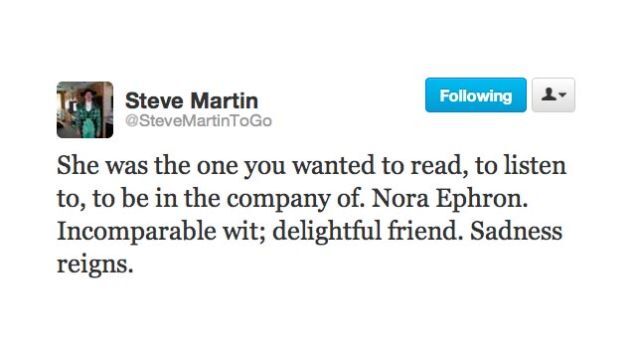 Nora Ephron was an inspiration to actors, directors, writers, musicians and normals alike, so it's no surprise that news of her death hit so many so hard. The outpouring of love sent her way on Twitter was particularly great with everyone from Steve Martin to Jean Grae to Judy Blume to Bret Easton Ellis tweeting out just how much they adored her. Here are some of the best 140-character eulogies.