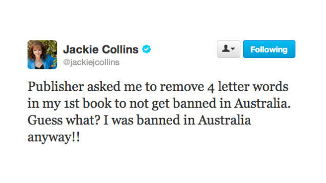 In this edition of Tweet Beat, Jackie Collins was too dirty for Australia, Chelsea Clinton joins Twitter, Ewan McGregor is excited about the space shuttle and Boy George reflects on Paris Hilton's Grindr remarks.