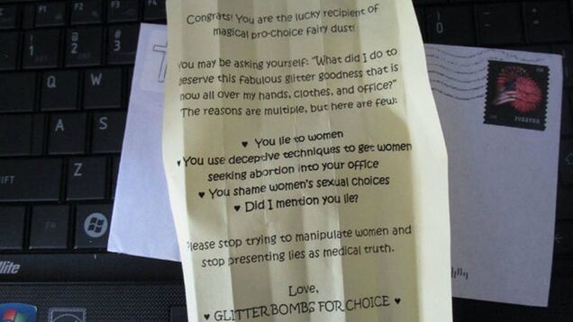 The newest round of beglittering has blanketed several dozens pregnancy centers, many of whom have been posting about it on Facebook. Their reactions generally fall into two categories: pretending they don’t mind, or else referring to the letters as “a bombing,” or calling the letters “insulting and intimidating.” (As we noted last time, real abortion clinics have been bombed by real, actual, designed-to-kill-you bombs 42 times since 1977.)