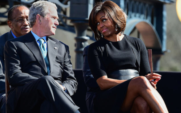 Former President George W. Bush and first lady Michelle Obama chatting before President Obama delivers a speech in honor of the 50th anniversary of "bloody sunday," a civil rights march in Selma, Alabama where protestors were severely beaten.