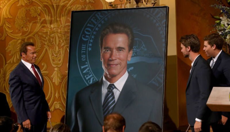 Caption This: Former California Gov. Arnold Schwarzenegger (L) looks at his official gubernatorial portrait with his sons Patrick (C) and Christopher (R) during an unveiling ceremony in the Rotunda of the State Capitol on September 8, 2014 in Sacramento, California. Former California Gov. Arnold Schwarzenegger was joined by current Gov. Jerry Brown to unveil his official gubernatorial portrait at the State Capitol.