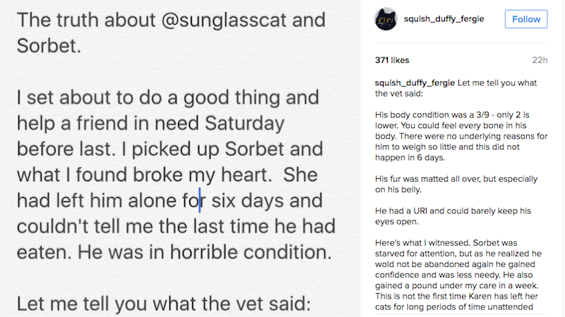 “I set about to do a good thing and help a friend in need Saturday before last,” Ruth explained in an Instagram post, entitled “The truth about @sunglasscat and Sorbet.” “I picked up Sorbet and what I found broke my heart. She had left him alone for six days and couldn’t tell me the last time he had eaten. He was in horrible condition.”