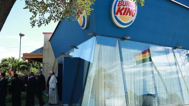 That’s according to ABC News, reporting on the Bolivian leg of his South American trip. He was scheduled to deliver mass, but he needed somewhere to change into his vestments. And so he ducked into Burger King: