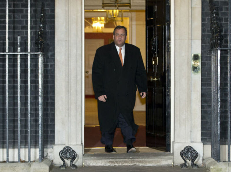 Chris Christie leaving 10 Downing Street after meeting Prime Minister David Cameron Monday. Christie's trip to London was paid for by a private group. Image via AP