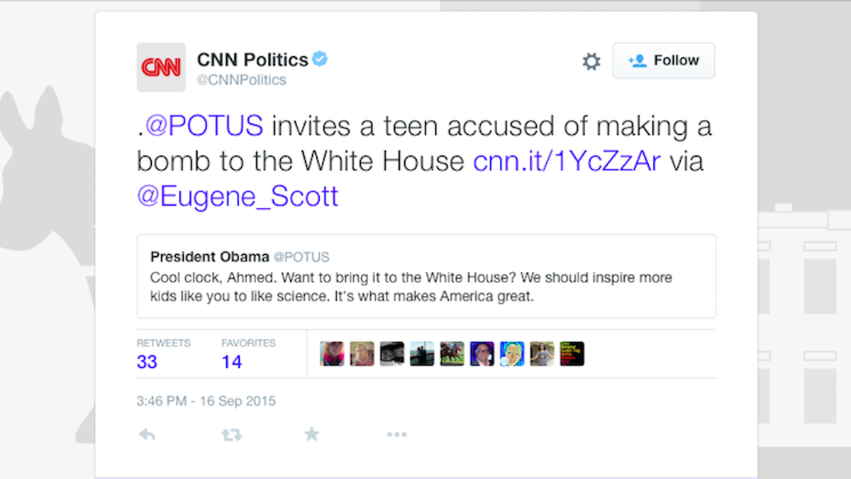 Perhaps in preparation for the GOP debate this evening, CNN Politics seems to have ingested some Fox News poison, which led them to write the above tweet, which implies that Obama is the crazy one for reaching out to a bomb-making child. The actual article is framed more fairly, referring to Mohamed as a “clock-making teen” and discussing the national shittiness that made this story possible.