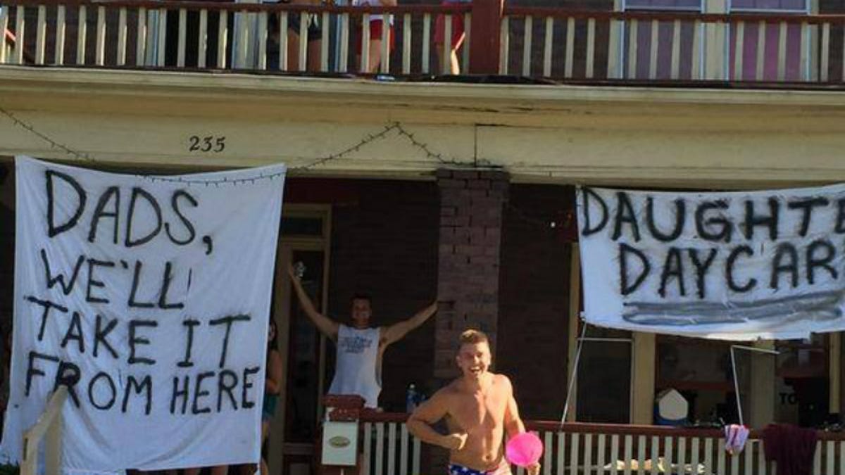 Yesterday it was frat boys at Old Dominion University offering a “freshman daughter drop-off” via enormous bedsheet banners hanging off the sides of their balcony. Today, the very cool guys are at Ohio State University in Columbus, where an off-campus house full of seniors is getting a lot of attention for their own banners, ones reading “Daughter Daycare 2.0” and “Dads, we’ll take it from here.” At least it’s punctuated correctly.