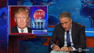 “We’ve been talking a lot about a certain Republican presidential candidate whose campaign has captured America’s inability to turn away from spectacular man-made disasters,” Stewart said at the opening of the show. “But much like excessive masturbation, eventually you feel a deep sense of shame. Not enough to stop you from doing it entirely, but enough to show you down a bit.”