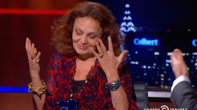 DVF has long been an outspoken feminist in the fashion world, whose easy-wearing, iconic designs—the wrap dress, of course, which she invented over 40 years ago—helped define an entire generation of liberated woman. On Colbert, she did her best to represent her ideologies, both philosophically and style-wise: "All I do," she said, "Is give women a little trick that is gonna make them look sexy and feel empowered."