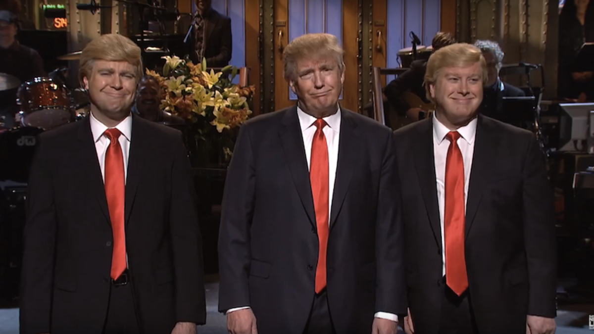 Perhaps because of television’s “equal time” rule which requires networks to offer equal time to every political candidate, Trump was absent from the majority of the episode—Variety measured his screen time at only 12 minutes of the 1.5-hour program. But his presence was fucking everywhere, mostly in the form of self-referential sketches where his name was either discussed or on screen the entire time. Let’s take a look: