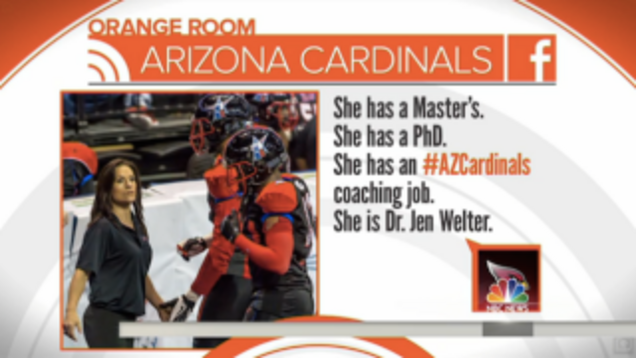 While San Antonio Spurs coach Becky Hammon breaks the glass ceiling in the NBA, Dr. Jen Welter has joined the Arizona Cardinals as the first female coach in NFL history. According to NBC News, she’ll be coaching inside linebackers as an intern during the Cardinals’ training camp and preseason.