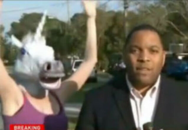 Here is a woman dressed as a unicorn wearing a tutu photobombing a live news report.