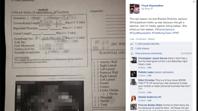A few problems with this, besides the fact that oh my fucking god what is wrong with you Floyd?: First, not to be Captain Abortion here, but as someone who has supported women in my life through abortions at various junctures throughout my young adulthood, this doesn't prove shit. They don't hand you, like, a souvenir The Child You Decided Not To Have packet when you go to the doctor for a pre-abortion sonogram. They don't even do that in Texas (although I'm sure they would if it weren't for the damn judicial system fucking Perry's creepy megachurch agenda up). A sonogram just proves the subject of the sonogram was pregnant; it doesn't prove how the pregnancy ended, or that the children were even his. It does prove that if she did have an abortion, she likely dodged a bullet. Floyd Mayweather is a terrible person, and terrible people make terrible fathers.