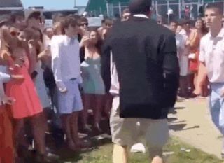 The video shows a young man in bright green shorts briefly fending off two attackers in button-downs, as a third individual rocking baby blue khakis drove through the trio to pound in the face of a man in a bow tie and boat shoes, whose blazer at this point has been ripped almost entirely in half. The man in the blue khakis swings, completely misses, and falls, at which point the gentleman in the bow tie, sensing his moment, kicks him in the throat and then also falls. A large crowd encircles our fighters, and they, too, are dressed like a community of poisonous tree frogs.