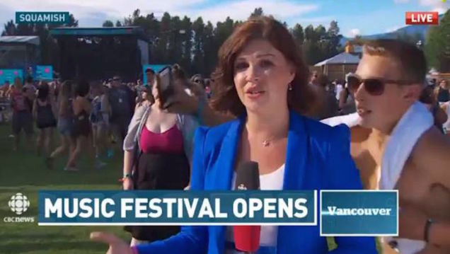A female newscaster was kissed by a random dude while she was reporting from a music festival this weekend. And while it was probably all fun and games for the dude in question, the Canadian Broadcasting Company is not laughing—they’re looking for him.