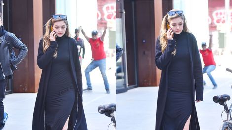 In case you hadn’t noticed, we were all photographed behind Gigi Hadid Wednesday afternoon as she left her New York City apartment. Hadid, dressed in a mock turtleneck dress with a flowing black coat, was chatting with someone on the phone (perhaps Yolanda, perhaps Bella, definitely not Zayn) as you and I, dressed in a red t-shirt and ripped blue jeans, waved our hands on the other side of the block.