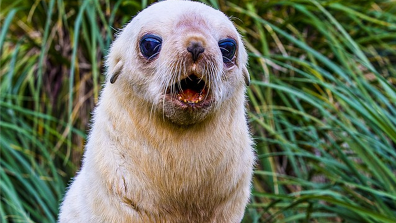 Shot by @paulnicklen while on assignment for@natgeo on South Georgia, #Antarctica. A newborn Antarctic fur seal pup perches itself on top of a mound of tussock grass. The majority of Antarctic fur seals are born with brown fur but approximately one in several thousand are born with white fur. Fur seals possess one of the highest degrees of sexual dimorphism of any mammalian species with males weighing up to five times greater than females.