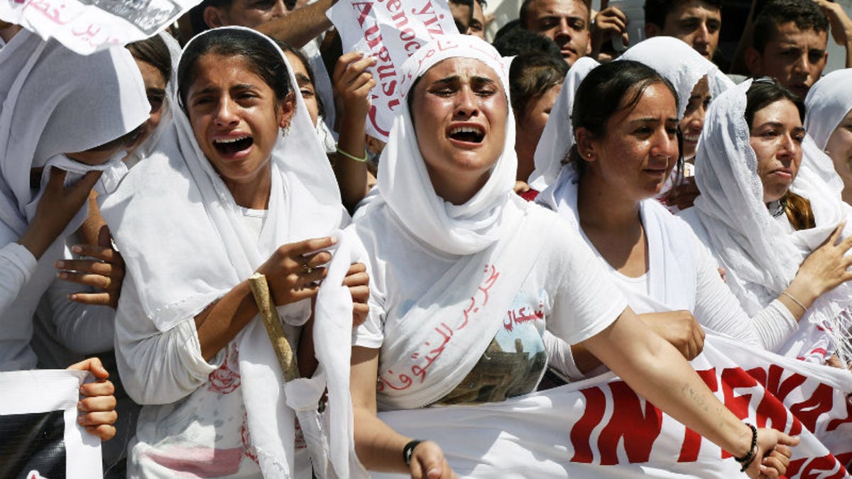 Yazidi Kurds at a protest marking one year since the invasion by ISIS of Yazidi communities in Northern Iraq August 3, 2015. Image via AP.