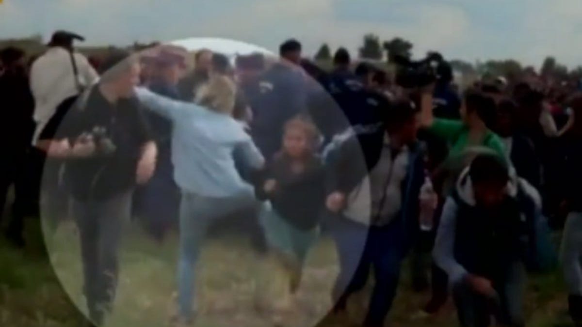 Agence France-Presse reports that the camerawoman, identified as Petra Laszlo of the station N1TV, was caught on camera tripping a man running with a child in his arms, then kicking another running child. Laszlo is in blue in the video and photographs captured on video and put on Twitter: