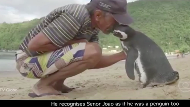Joao told Globo TV, “I love the penguin like it’s my own child and I believe the penguin loves me. No one else is allowed to touch him. He pecks them if they do. He lays on my lap, lets me give him showers, allows me to feed him sardines and to pick him up.”