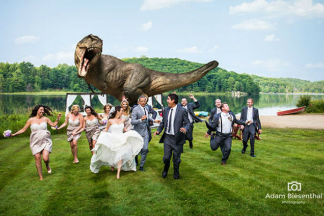 Shared on Reddit's r/pics forum in a post called "When Jeff Goldblum Is a Guest at Your Wedding," the picture by Adam Biesenthal features the Jurassic Park actor running from a T-Rex with a wedding party. To appease the "IT'S FAKE/LOOKS 'SHOPPED" crowd, here is an explanation by Huffington Post from the photographer. Yes, the T-Rex is fake, no the Goldblum is not: