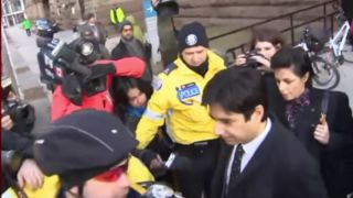 Ghomeshi and Henein leave the courthouse. Screenshot via CBC