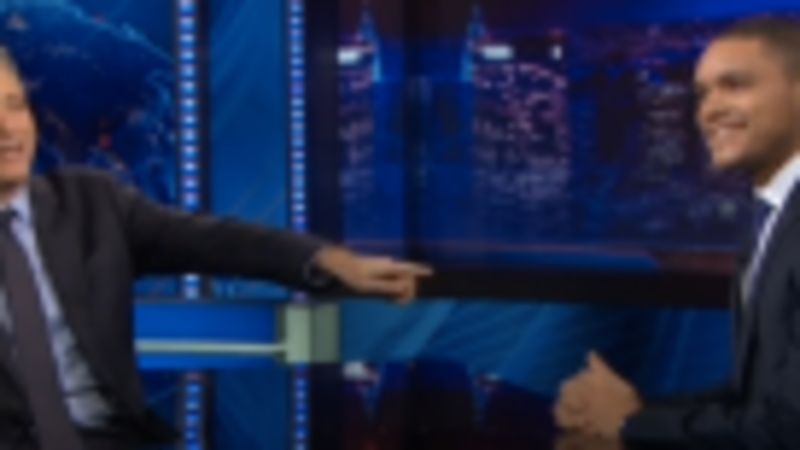 After Stewart's introduction, Noah jokes, "I just flew in and boy are my arms tired." The comedian then clarifies himself, doing the "hands up, don't shoot" motion in reference to cop murders. "I never thought I'd be more afraid of police in America than in South Africa," he says. "Kinda makes me nostalgic for the old days back home."
