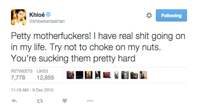 While Khloe has yet to deny being a pie fraud—or maybe she was still heated about negative comments on the “belfie” she posted yesterday. Who can tell these days!—but she does find it odd that peopl (specifically, “petty motherfuckers!”) care so much about the inanities of her life.